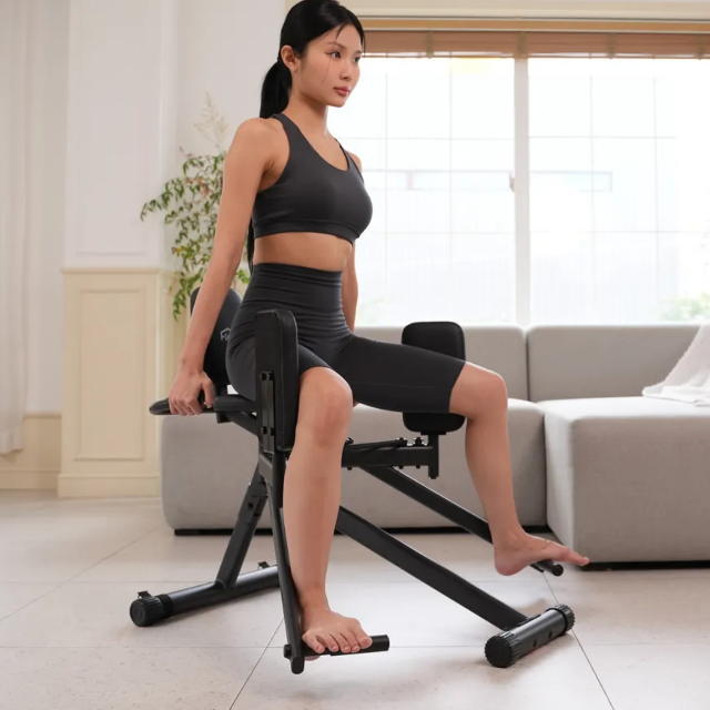 허리와 엉덩이를 밀착해 앉은 후 양쪽다리를 발판에 올려 무릎을 살짝 구부려 펴주세요.