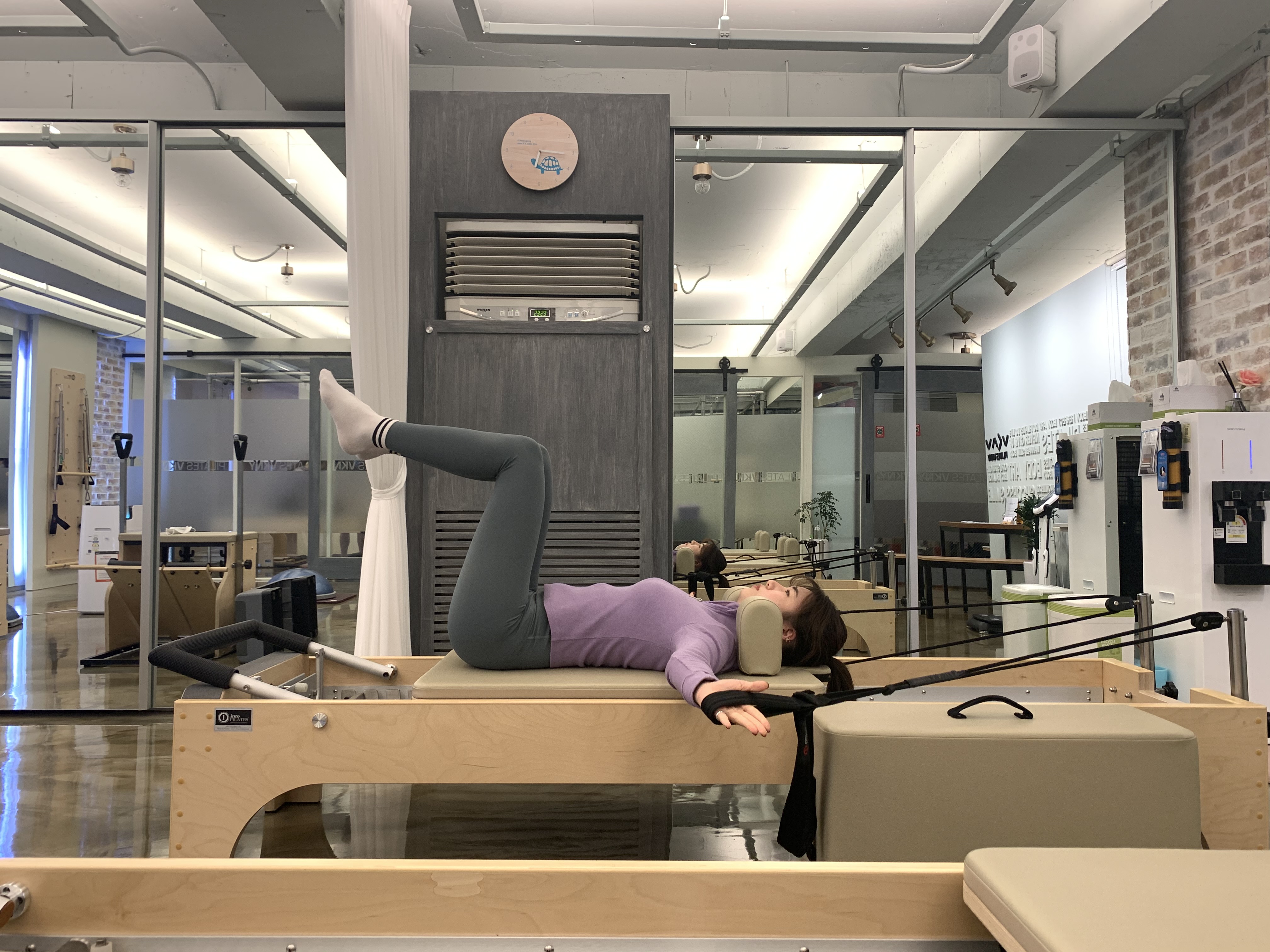리포머 위에 천장을 보고 누워주세요