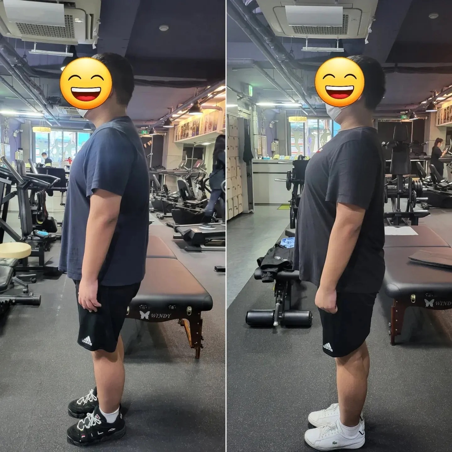 처음부터 정확한 자세 관리가 필요했고 체형 교정 프로그램을 진행한 상황은, 사진과 같이 3주의 트레이닝으로 좋은 결과가 많이 보입니다.
