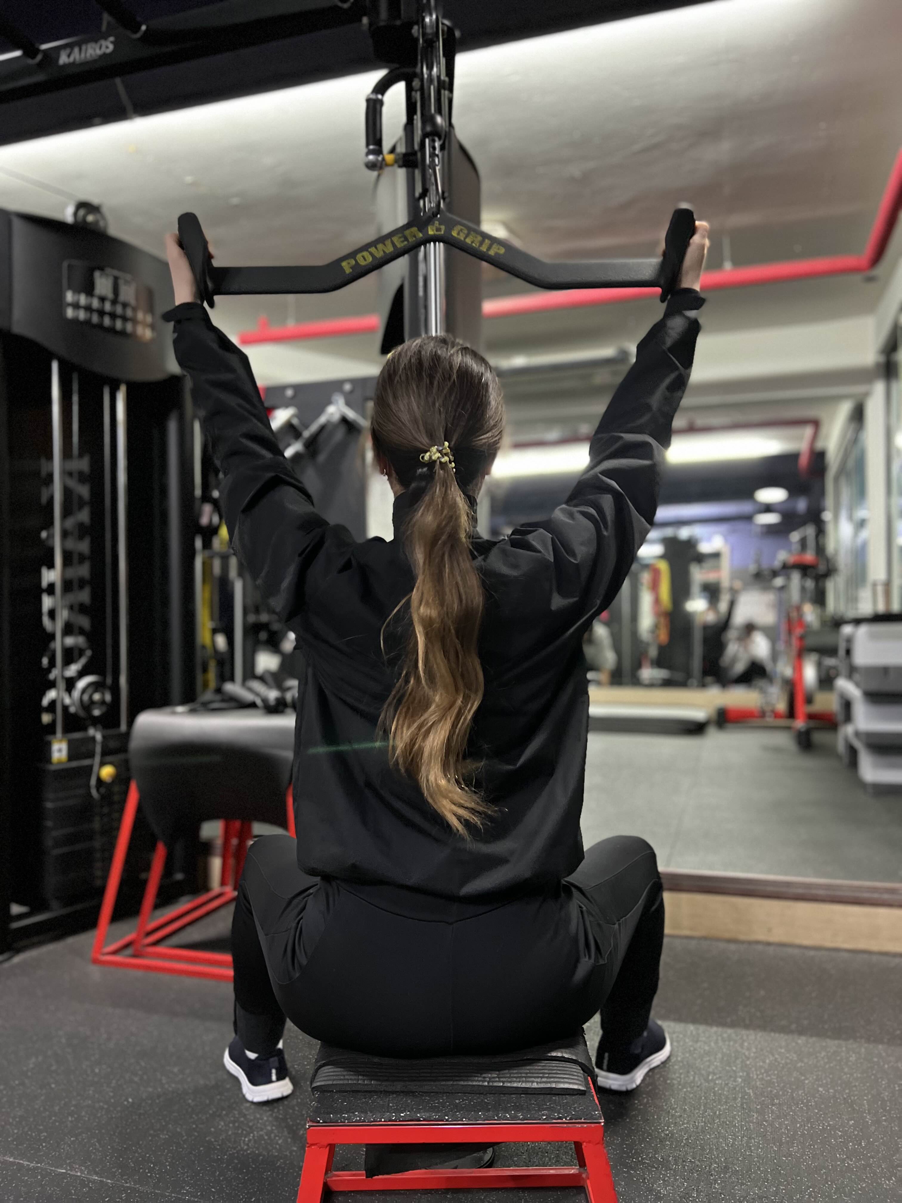 양손은 바를 걸치듯 잡아준 뒤 어깨가 올라가지 않게