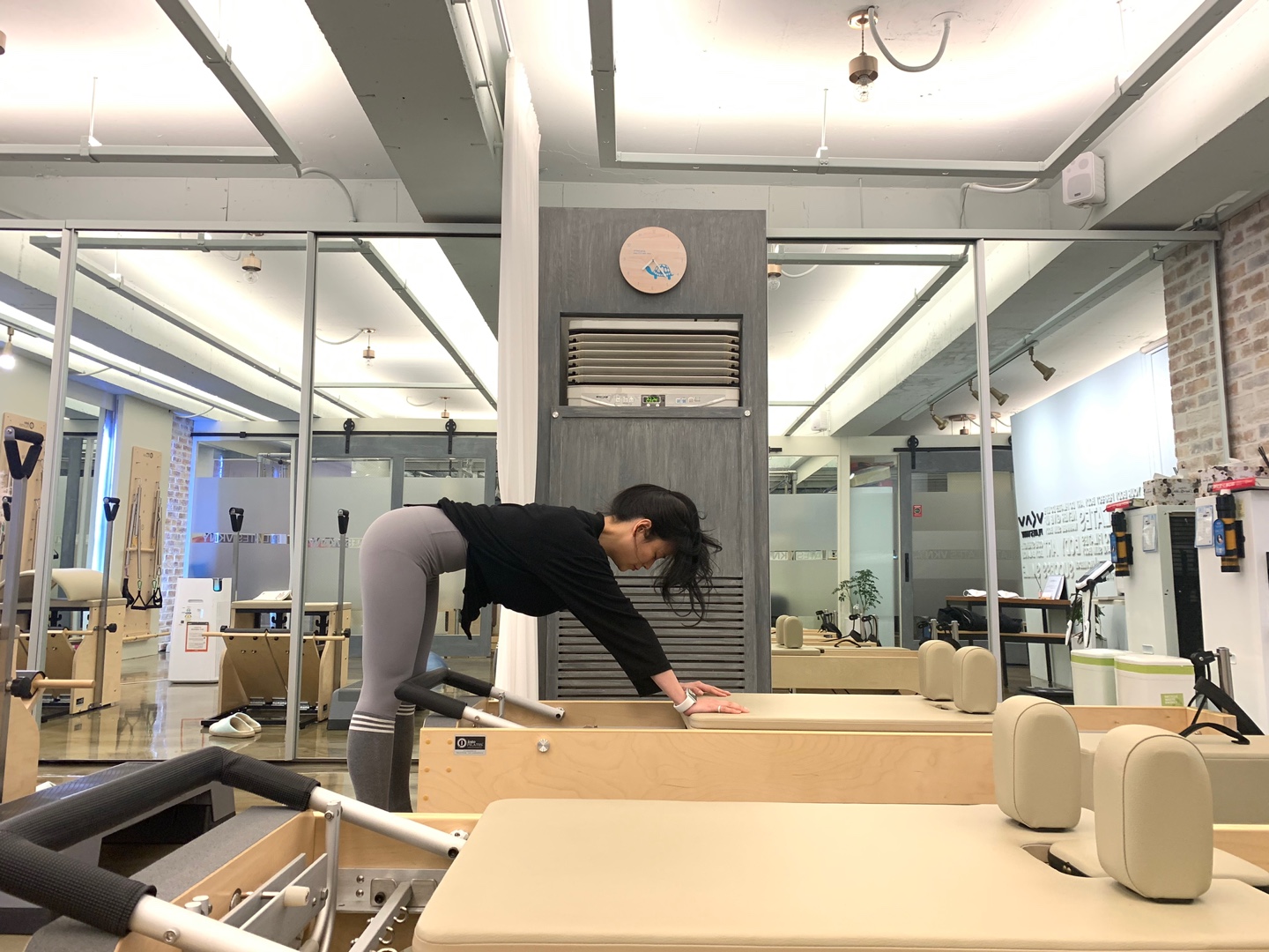 스탠딩 롤다운으로 상체를 숙여 리포머의 캐리지 양 끝을 손으로 잡아주세요