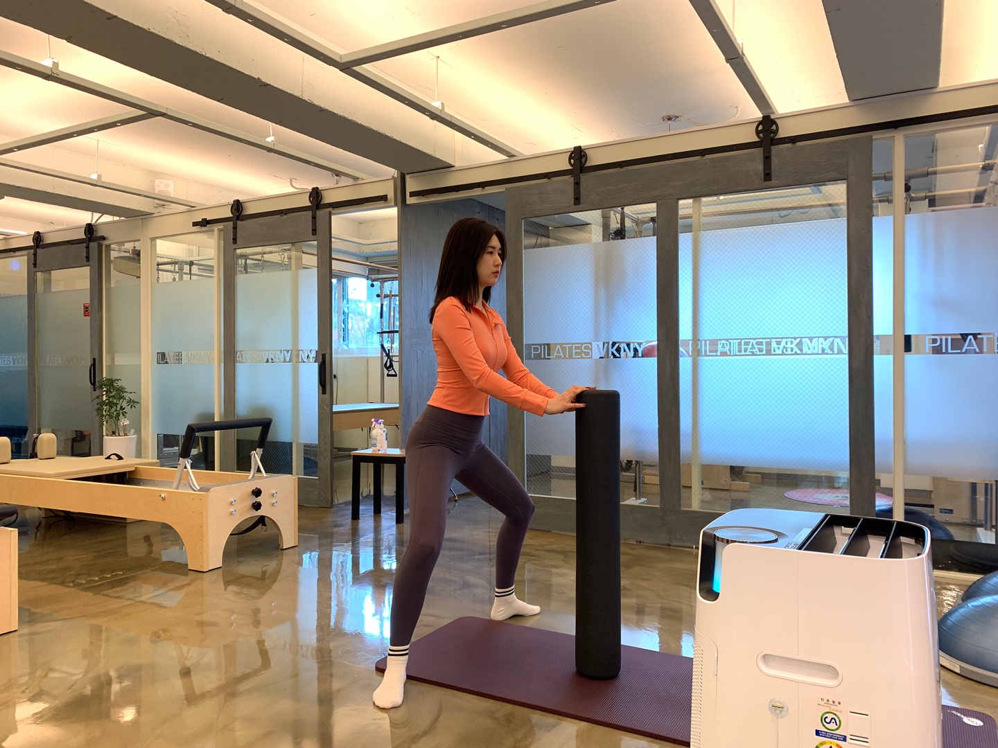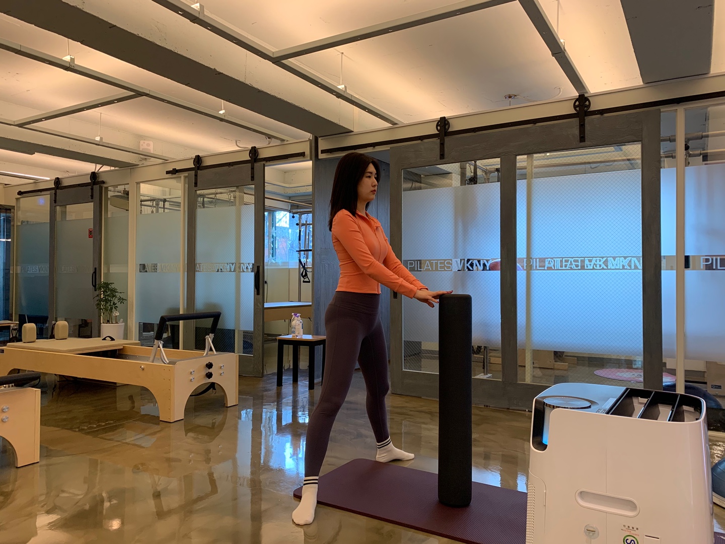 앞에 있는 폼롤러 위에 양 손을 올려놓고 준비해주세요